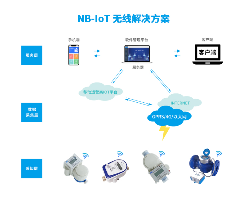 终端智慧水表通过集成NB-IoT标准模组,与NB-IoT基站连接来实现通讯能力,通过NB-J0T基站将信息上传给IoT平台;